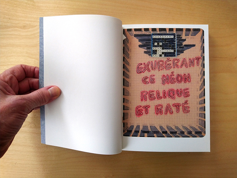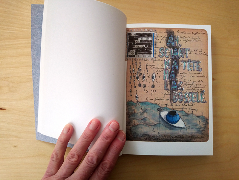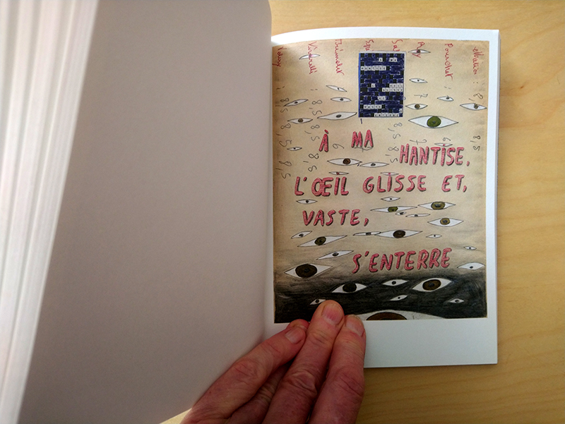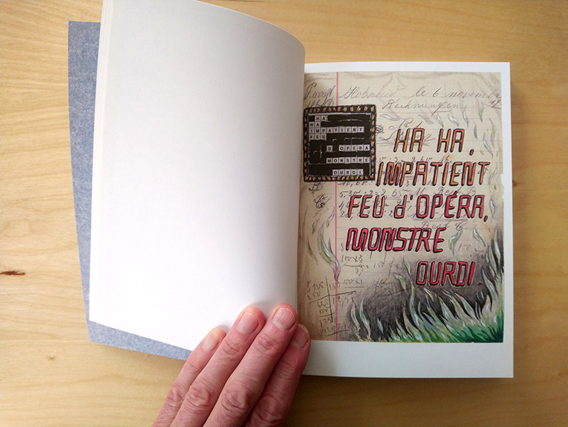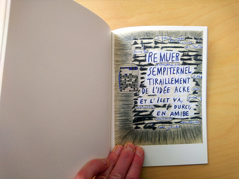Ensuite le dessin, qui unit ces 2 premières pratiques. Une fois collés les mots croisés, les mêmes mots sont redessinés sur la page dont certains éléments sont déployés ou masqués.